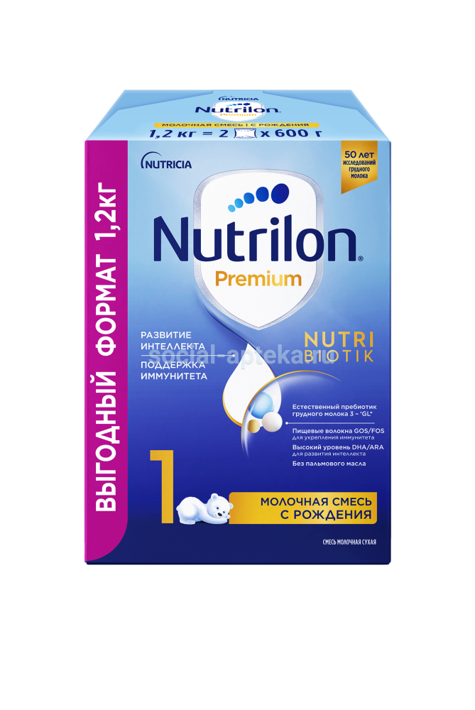 NUTRILON-1 PREMIUM СМЕСЬ МОЛОЧНАЯ СУХАЯ Формула нового поколения с уникальным комплексом Pronutri* помогает Вашему ребёнку развиваться: Пребиотики GOS/FOS способствуют развитию собственной здоровой микрофлоры кишечника и поддерживают иммунитет ребёнка, помогая снижать риск возникновения аллергии и инфекций, Улучшенный комплекс особых жирных кислот ARA/DHA способствует развитию его интеллекта, Сбалансированный комплекс витаминов и минералов, разработанный специально с учетов потребностей детей до года, способствует правильному росту ребенка. Nutricia более 30 лет занимается изучением грудного молока. Благодаря многолетним научным исследованиям молочные смеси Nutrilon по составу и основным свойствам приблизились к совершенству. Грудное молоко - лучшее питание для детей раннего возраста. Premium = Премиальный Pronutri+ = Пронутри+ В каких случаях используется Nutrilon® 1 Premium. Для детей раннего возраста грудное молоко является наилучшим питанием. Nutrilon® 1 Premium используется в питании малышей при недостатке грудного молока у мамы или отсутствии возможности грудного вскармливания. Пищевая ценность (на 100 мл готовой смеси)белки 1,3 г, углеводы 7,3 г, жиры 3,4 г, энергетическая ценность 65 ккал / 270 кДж Пищевая ценность (на 100 г сухого продукта)белки 9,7 г, углеводы 53,8 г, жиры 24,7 г, энергетическая ценность 476 ккал / 1990 кДж Перед применением смеси проконсультируйтесь со специалистом. Несоблюдение инструкций по приготовлению и хранению смеси может нанести вред здоровью ребенка. Никогда не оставляйте Вашего ребенка одного во время кормления. Для детского питания. Внимание: -Готовьте питание непосредственно перед употреблением! -Не используйте остатки питания для последующего кормления! -Не подогревайте смесь в СВЧ-печи во избежание образования горячих комочков смеси -Строго соблюдайте рекомендации по количеству смеси при приготовлении и ничего не добавляйте в приготовленную смесь -Новую смесь в рацион ребенка необходимо вводить постепенно.