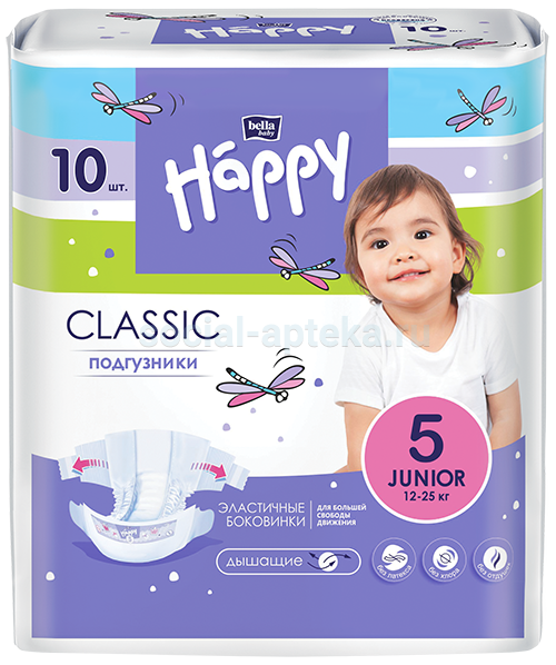 Подгузники bella baby Happy размера junior предназначены для малышей весом от 12 до 25 кг. Подгузники bella baby Happy созданы специально для активных детей. Эластичные боковинки c многоразовыми застежками-липучками обеспечивают лучшее прилегание к телу малыша и более удобное одевание подгузника! Внешний слой изделия выполнен из паропроницаемого материала, который обеспечивает постоянный доступ воздуха к коже малыша, защищая ее от опрелостей. Специальный слой quick dry ускоряет распределение влаги по всей поверхности подгузника бэлла бэби Хэппи и обеспечивает чувство сухости. Детские подгузники bella baby Happy дерматологически проверены, не содержат хлора, латекса и отдушек!