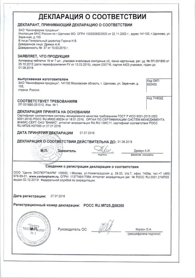 1 таблетка содержит: активное вещество: кандесартана цилексетил 16 мг; вспомогательные вещества: крахмал кукурузный прежелатинизированный - 23,8 мг, кроскармеллоза натрия (примеллоза) - 5 мг, лактозы моногидрат (сахар молочный) - 90 мг, магния стеарат - 1 мг, повидон-К30 - 4,2 мг.
