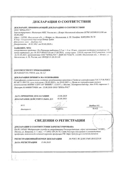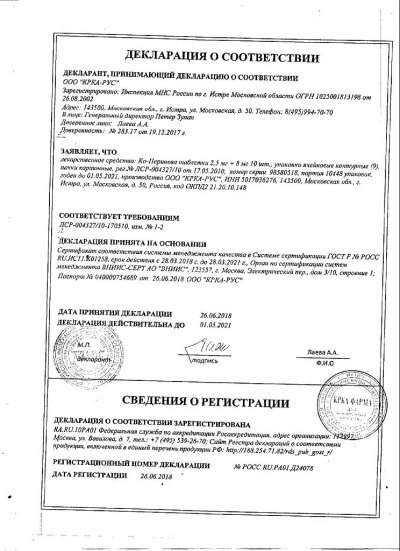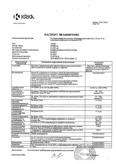 в 1 таблетке содержится: периндоприла эрбумина 2 мг, индапамид 625 мкг.
