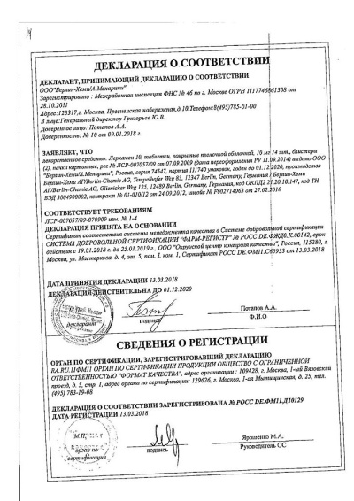 Вспомогательные вещества: лактозы моногидрат, целлюлоза микрокристаллическая (тип РН-101), карбоксиметилкрахмал натрия (тип А), повидон - К30, магния стеарат.