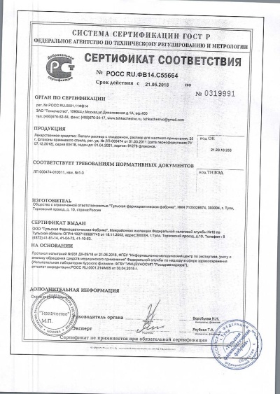 Фармацевтически несовместим с эфирными маслами, растворами аммиака. Щелочность или кислотность сред, присутствие жира, гноя, крови ослабляют антисептическую активность.
