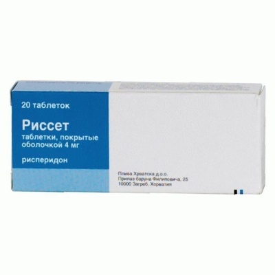 Риссет - антипсихотическое средство (нейролептик), производное бензизоксазола; оказывает также седативное, противорвотное и гипотермическое действие. Селективный моноаминергический антагонист, обладает высокой тропностью к серотонинергическим 5-НТ2 и дофаминергическим D2-рецепторам, связывается также с α1-адренорецепторами и с несколько меньшей аффинностью — с Н1-гистаминергическими и α2-адренергическими рецепторами. Не обладает тропностью к холинорецепторам.Антипсихотическое действие обусловлено блокадой дофаминовых D2-рецепторов мезолимбической и мезокортикальной системы. Седативное действие обусловлено блокадой адренорецепторов ретикулярной формации ствола головного мозга; противорвотное действие — блокадой дофаминовых D2-рецепторов триггерной зоны рвотного центра; гипотермическое действие — блокадой дофаминовых рецепторов гипоталамуса.Подавляет продуктивную симптоматику (бред, галлюцинации, агрессивность), автоматизм. Вызывает меньшее подавление моторной активности и в меньшей степени индуцирует каталепсию, чем классические антипсихотические средства — АПС (нейролептики). Сбалансированный центральный антагонизм к серотонину и дофамину может уменьшать склонность к экстрапирамидным побочным действиям и расширять терапевтическое воздействие препарата с охватом негативных и аффективных симптомов шизофрении. Может индуцировать зависящее от дозы увеличение концентрации пролактина в плазме.ФармакокинетикаАбсорбция — быстрая и полная (пища не влияет на полноту и скорость абсорбции). Абсолютная биодоступность — 74%; относительная (таблетки по сравнению с раствором) — 94%. Tmax в плазме рисперидона — 1 ч; 9-гидроксирисперидона — 3 ч (при высокой активности изоферментаCYP2D6) и 17 ч (при низкой активности изофермента CYP2D6).Css рисперидона в организме у большинства пациентов достигается в течение 1 дня, а 9-гидроксирисперидона — 4–5 дней. Концентрации рисперидона и 9-гидроксирисперидона в плазме пропорциональны дозе препарата (в пределах 1–16 мг/сут). Быстро распределяется по организму, проникает в ЦНС, грудное молоко. Vd — 1–2 л/кг. Связь с белками плазмы (с α1-кислый гликопротеин и альбумины) рисперидона — 90%, 9-гидроксирисперидона — 77%.Метаболизируется изоферментом CYP2D6 до активного метаболита 9-гидроксирисперидона (рисперидон и 9-гидроксирисперидон составляют активную антипсихотическую фракцию). Другим путем метаболизма является N-дезалкилирование.T1/2 рисперидона — 3 ч (при высокой активности изофермента CYP2D6) и 20 ч (при низкой активности изофермента CYP2D6), T1/2 9-гидроксирисперидона — 21 ч (при высокой активности изофермента CYP2D6) и 30 ч (при низкой активности изофермента CYP2D6); активной антипсихотической фракции — 20 ч.Выводится почками 70% (35–45% в виде фармакологически активной антипсихотической фракции) и с желчью (14%).При хронической почечной недостаточности (ХПН) клиренс креатинина снижается на 60%.При печеночной недостаточности содержание рисперидона в плазме повышается на 35%.У пожилых пациентов снижается клиренс и удлиняется T1/2.
